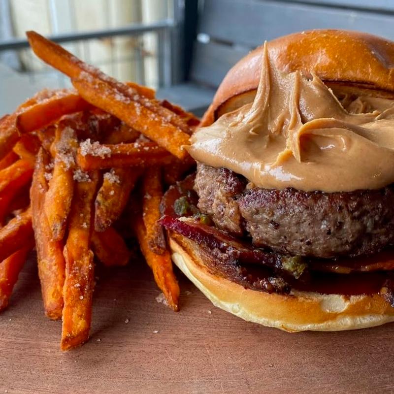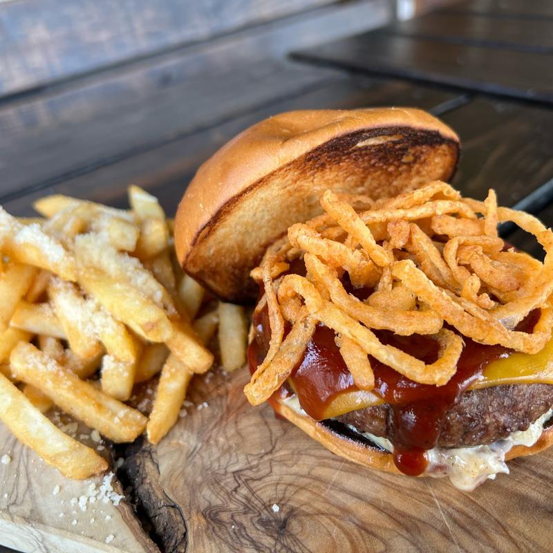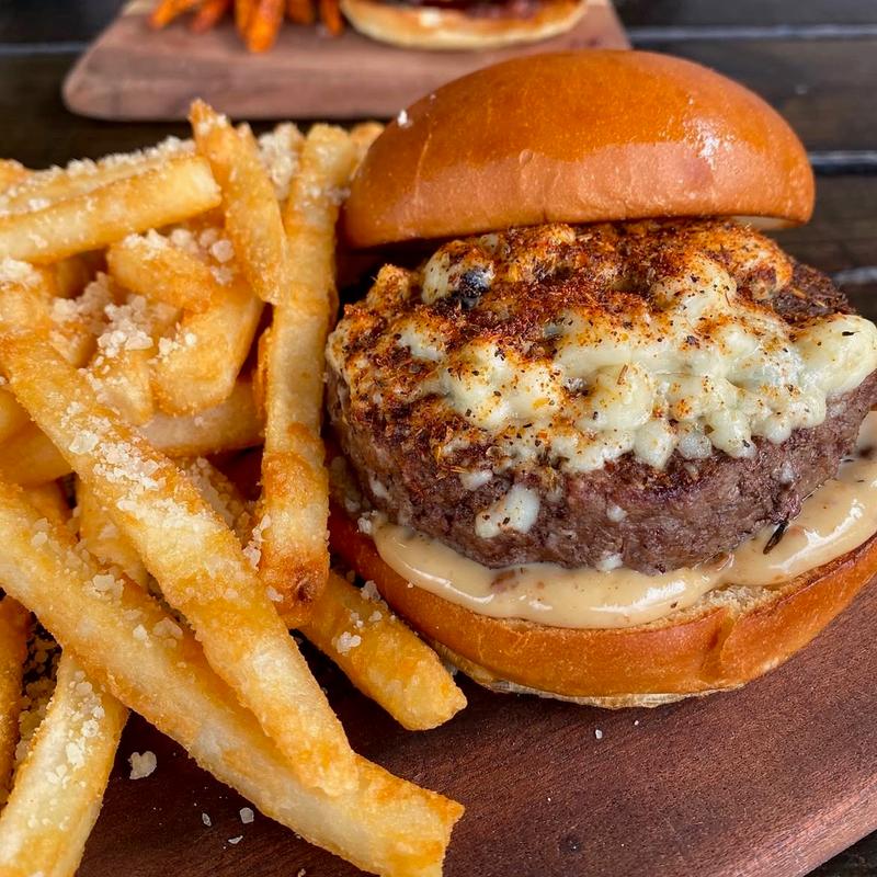 100% grass-fed burgers served with choice of side: truffle mac n' cheese, kettle chips, side house salad, bourbon chili, sweet potato fries, or flavor fries: bacon dust, truffle parm, sun-dried tomato | Substitute any grass-fed beef patty for a Beyond Beef or turkey patty.
